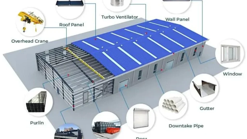 The building envelope is completed using high-strength profiled metal sheets or sandwich panels for roofing and wall cladding, along with thermal insulation, skylights, ridge ventilators, louvers, doors, and other accessories. All components are engineered for performance parameters such as structural strength, serviceability, thermal efficiency, corrosion resistance, and long-term durability.
